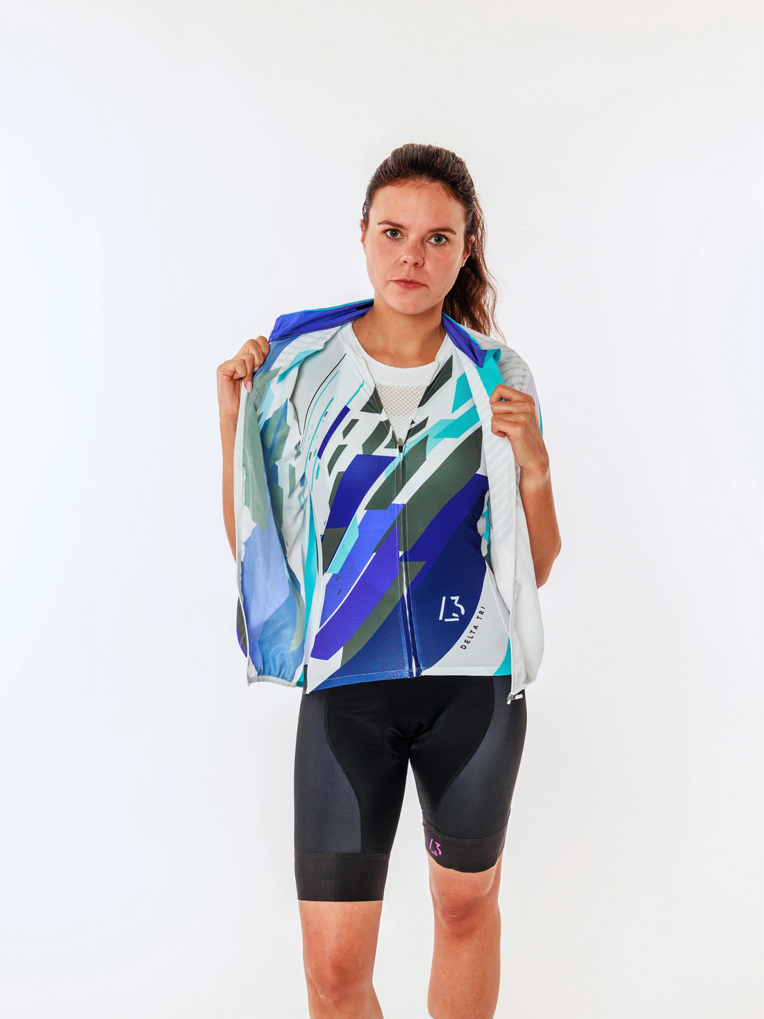 Die Cycling Funktions-Weste Grid Edition in Weiß mit blauen und türkisen Rechtecken kombiniert funktionale Performance...