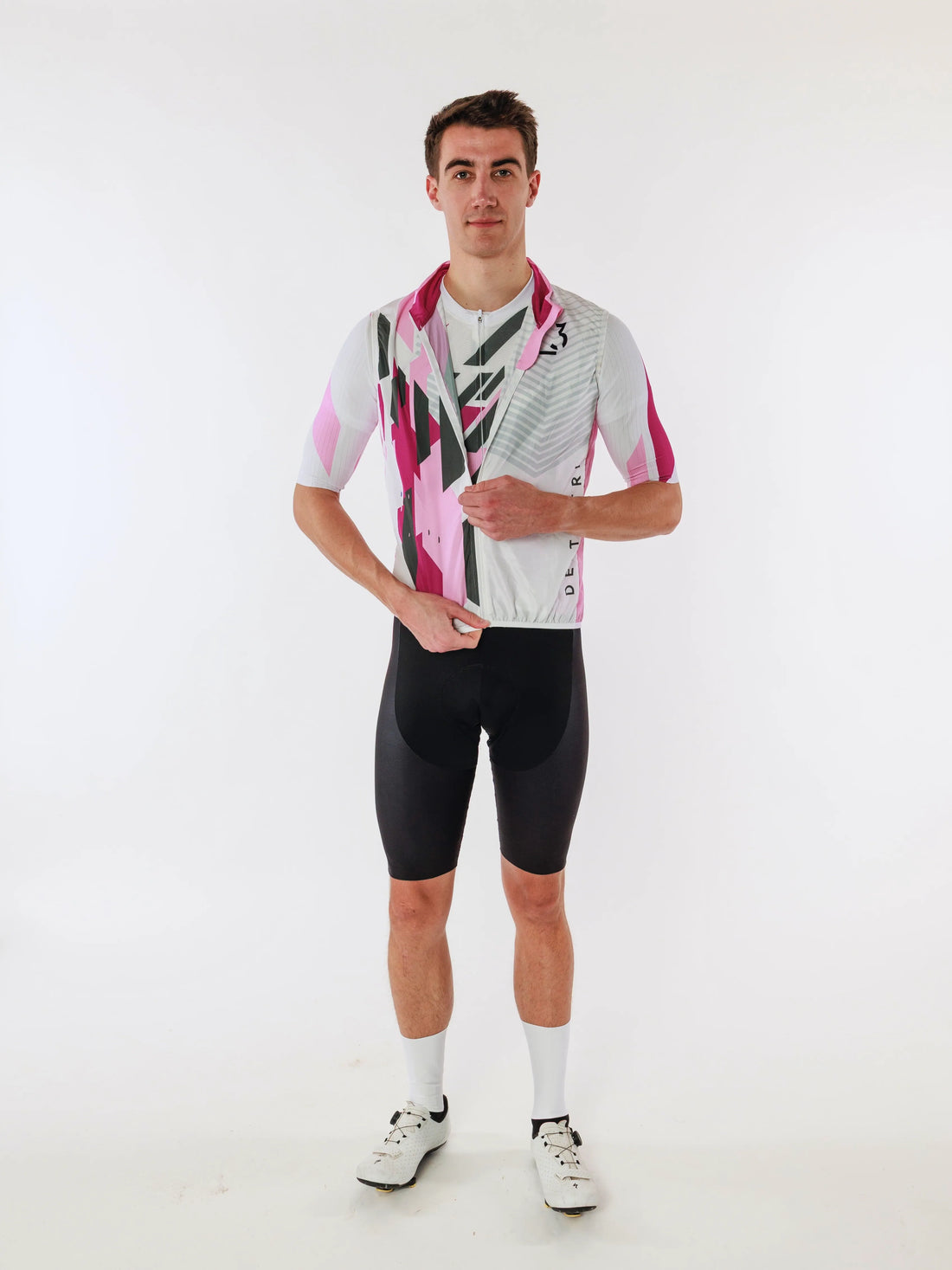 Die Cycling Funktions-Weste Grid Edition in Weiß mit rosa und pinken Rechtecken kombiniert funktionale Performance...
